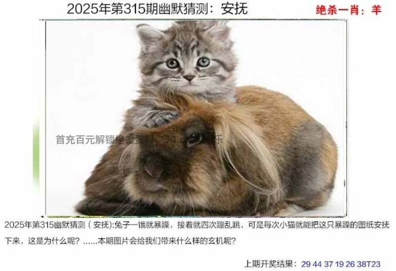 315期图片猜测(安抚)【开:發00】 兔子一饿就暴躁,接着就四次蹦乱跳,可是每次小猫就能把这只暴躁的图纸安抚下来,这是为什么呢?......本期图片会给我们带来什么样的玄机呢? 解:兔子解天肖兔马猴猪牛龙幽默猜测推荐六肖:牛龙兔猴猪马本期猜测看好十码:05.29.14.26.15.39.22.34.07.24点击注册30.cc娱乐城3090.com大额无忧 |